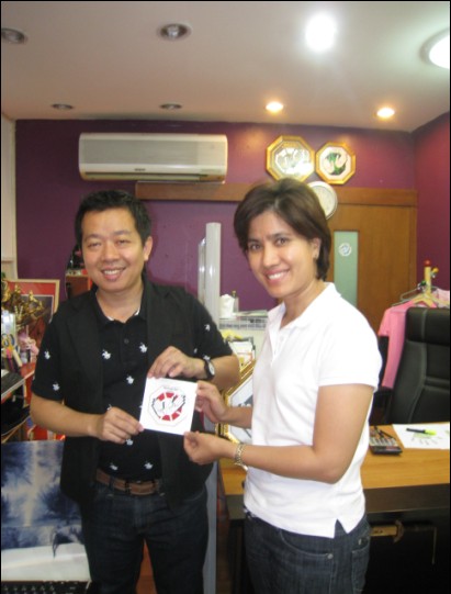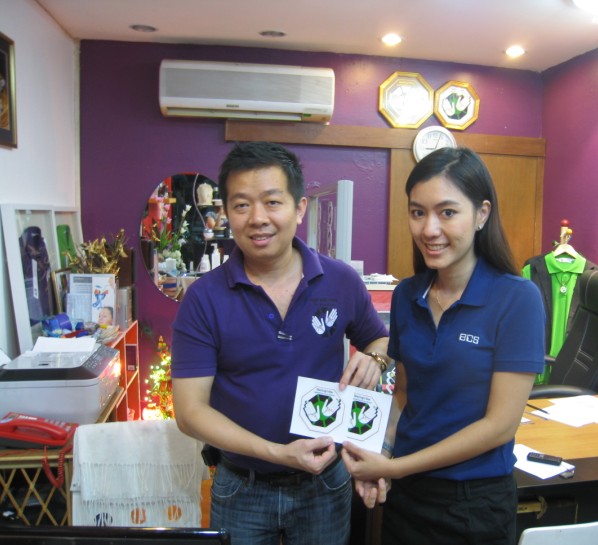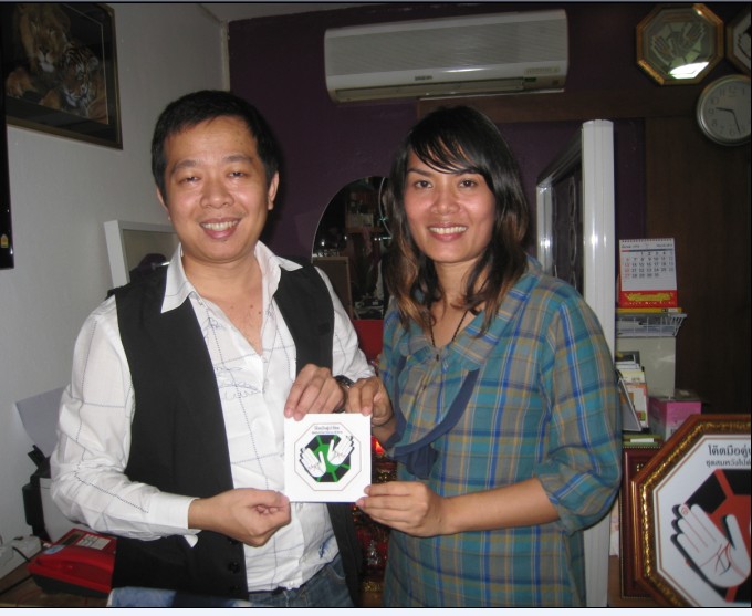 อ.หนึ่ง มอบสติกเกอร์นำโชค ชุดสมหวังการงาน/ค้าขาย เป็นหนึ่งในผลิตภัณฑ์ของธนาคารลายมือไทยไชโย สำหรับไว้ติดรถยนต์ หรือกระจกร้านค้า ทำให้การค้าเจริญรุ่งเรือง